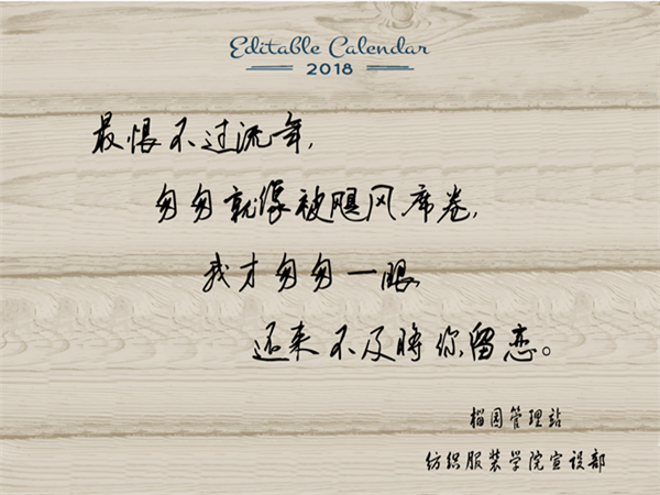 在2018年到来之际,榴园管理站组织纺院青协宣传部的同学创作了二套2018年日历。其中人物形象以榴园女生为原型,以期待新的一年为主题,加上丰富的色彩元素构成了优美清新的画面,寓意在新的一年里,同学们的生活可以像日历的画面那样精彩纷呈。
